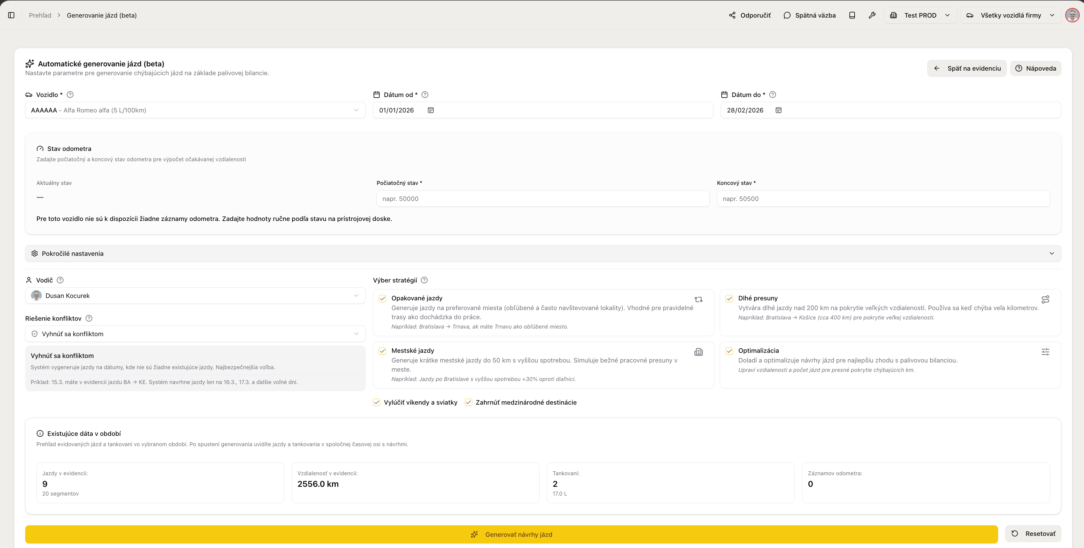 Generovanie jázd (niekedy označované ako automatické generovanie jázd alebo automatika pre evidenciu jázd) je funkcia, ktorá na základe existujúcich údajov – najmä tankovaní a stavov tachometra – navrhne chýbajúce služobné jazdy tak, aby sedela palivová bilancia. Namiesto toho, aby ste manuálne dopĺňali každú jazdu do evidencie a do knihy jázd, systém navrhne jazdy, ktoré „zapadnú“ medzi tankovania a záznamy tachometra. Vy si ich v náhľade skontrolujete a jedním klikom uložíte do evidencie. Následne z nich môžete vytvoriť záznam o prevádzke vozidla (knihu jázd) a exportovať ho do Excel (xlsx), CSV alebo iných formátov – rovnako ako pri klasickej evidencii.