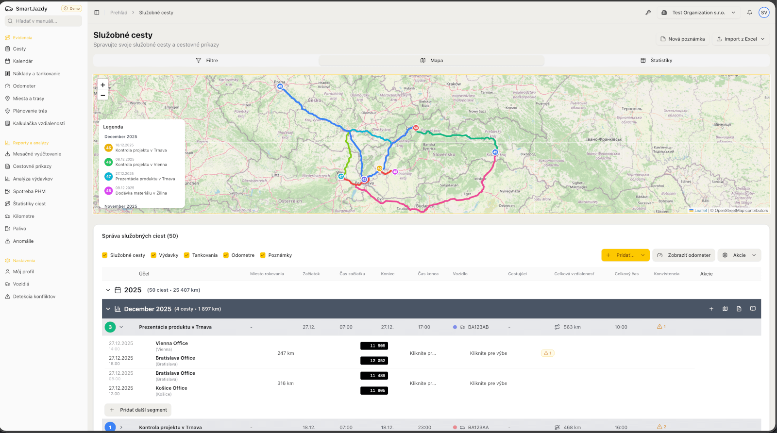 Pridáte každú služobnú jazdu – kam, kedy, prečo. Môžete pridať aj výdavky (tankovanie, servis, parkovné). Systém automaticky vypočíta vzdialenosti a náklady.